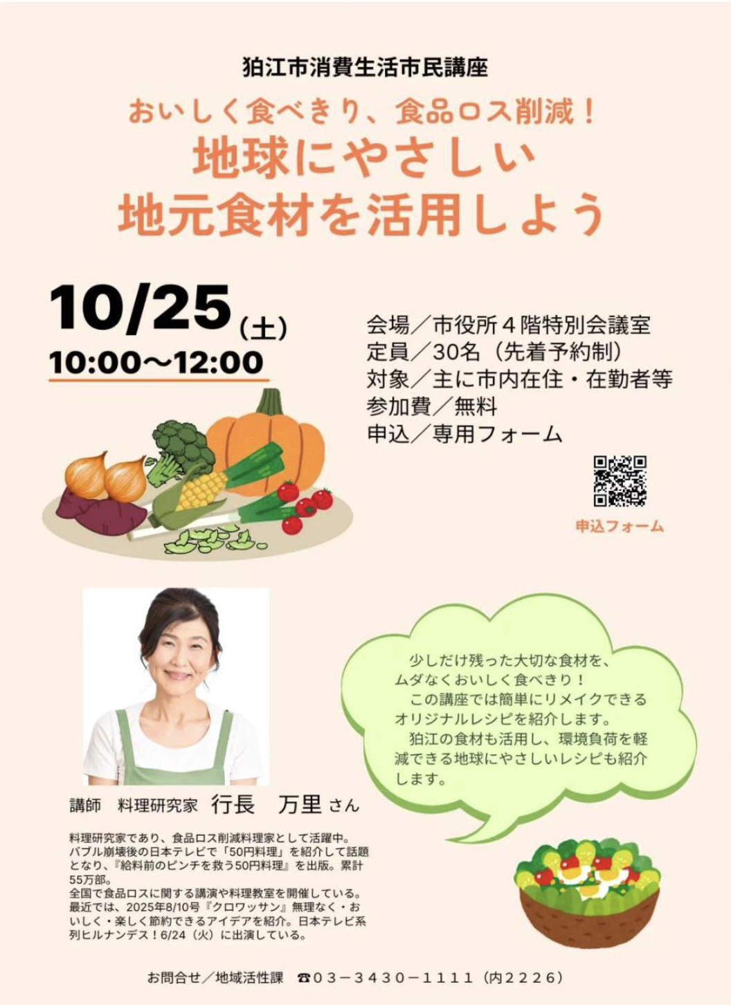 ご家庭で食材の賞味期限・消費期限がせまり、使い道に困ったり、食材を余らせてしまったご経験はありませんか?本講座では、講師が考案する「ご家庭で余りがちな食材を使ったメニュー」を実際に調理することで、まだ食べられるのに捨てられている食品(=食品ロス)を減らすための工夫を、調理実習形式で楽しく学ぶことができます。お申込み、お待ちしております。